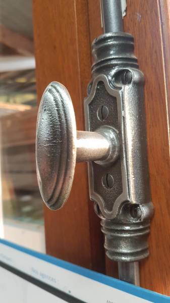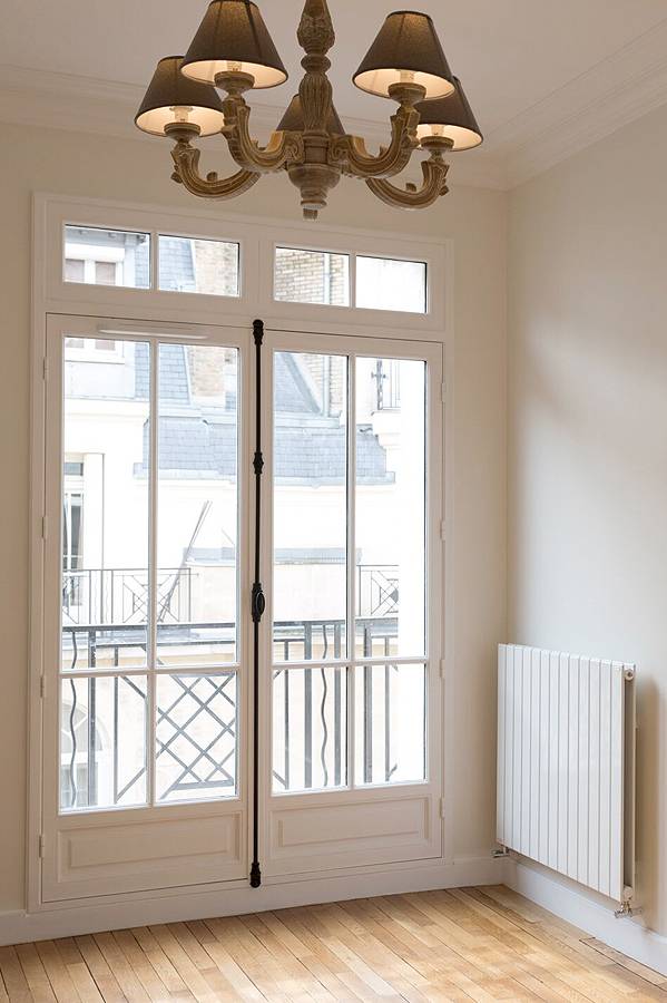 En option, nous pouvons installer des volets intérieurs en bois fixés sur les paumelles des fenêtres, des petits-bois mortaisés, des véritables crémones fonte en applique avec espagnolettes, soubassements moulurés, etc....