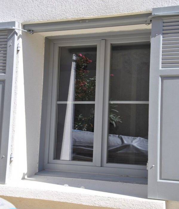 La teinte de nos fenêtres en PVC gris se retrouve également sur les volets battants et roulants, pour une totale harmonie.