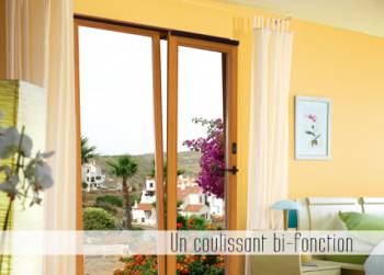 - l'oscillo-coulissant, qui combine l'ouverture latérale avec la position oscillo-battante (attention 1 seul panneau coulisse, le 2nd est fixe)